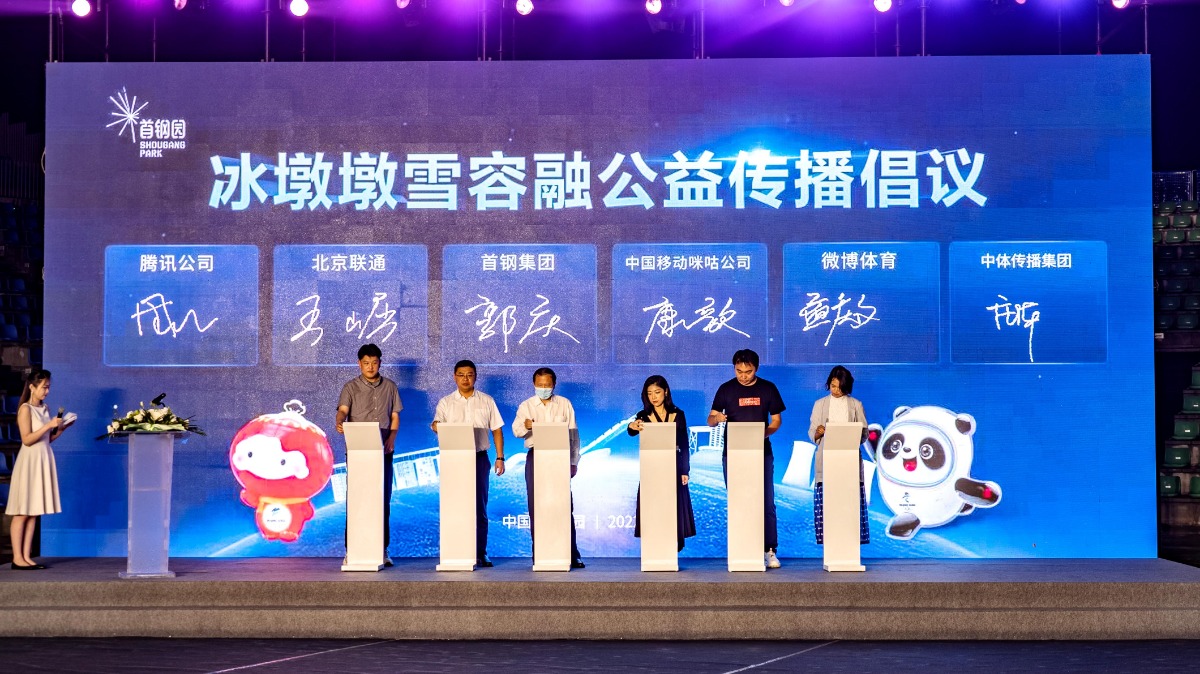 图:首钢集团联合咪咕、联通、腾讯、新浪微博体育、中体传播集团等企业共同发起《冰墩墩雪容融公益传播倡议》签约仪式