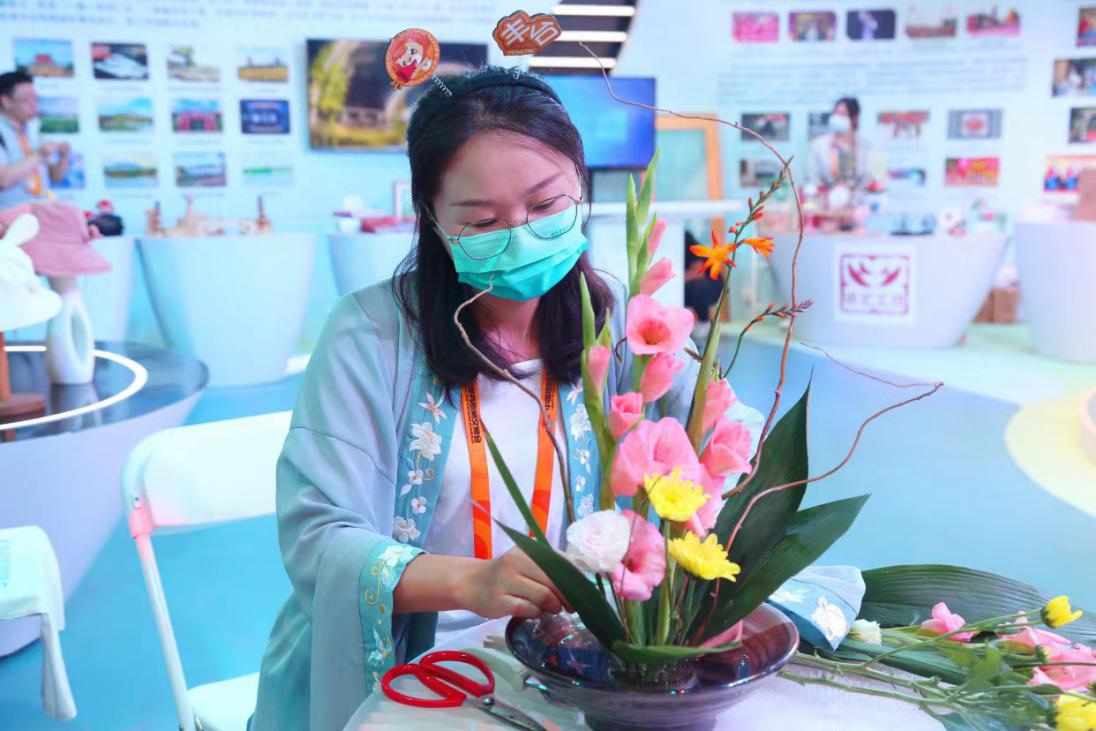 阵列渐变式多屏联动技术的炫彩,仿真绿植造景布置的生机,戏曲表演的写意,插花艺术的雅致,榫卯结构等非遗技艺文创产品……多元化呈现丰台区优势文化资源、产业创新融合发展方面的成果,擦亮丰台高品质文旅金名片。