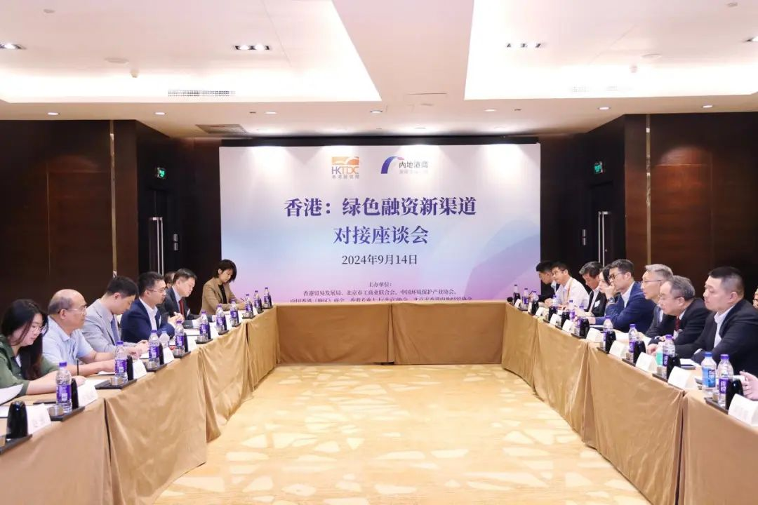 9月14日,香港贸易发展局、北京市工商业联合会、中国环境保护产业协会、中国香港(地区)商会、香港专业人士(北前)协会、北京市香港内地经贸协会共同主办,北京市科学技术委员会、中关村科技园区管理委员会、北京市商务局支持的“香港:绿色融资新渠道”对接座谈会于北京北辰洲际酒店会议厅举办。