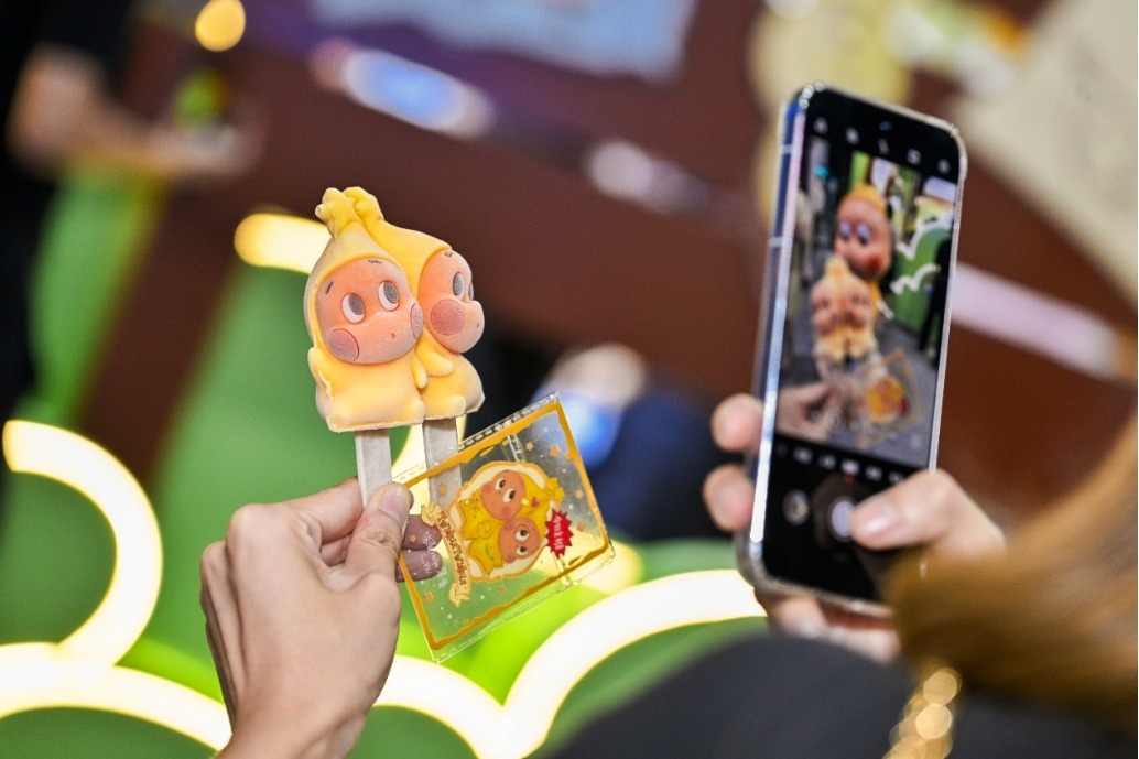 本届服贸会,泡泡玛特首次作为独家潮流文化品牌合作伙伴参展,在1号馆以甜品屋为灵感,将IP融入梦幻般的甜品装饰之中,吸引众多观众驻足拍照。泡泡玛特首次于服贸会发售甜品,并携手服贸会共同推出主题甜品礼盒,将展会特色与IP主题巧妙结合,极大丰富了现场消费体验。从DIMOO饼干、THE MONSTERS曲奇、星星人、SKULLPANDA雪糕,到MOLLY巧克力,观众不仅能够大饱眼福,还可以现场品尝,享受视觉与味觉的双重盛宴。