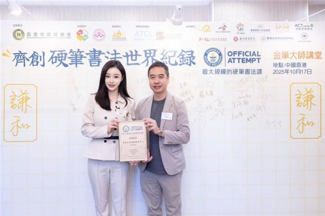 2025年10月17日,梁显利油麻地社区中心热闹非凡,一场洋溢着文化气息与青春活力的“金笔大师讲堂——齐创硬笔书法世界纪录”活动在此盛大举行。该活动由香港宋庆龄基金、We Like Hong Kong、沪港妇女会主办,民政事务总署协办,香港生涯规划教育中心等机构积极支持。来自香港油尖旺区多间中小学的291名学生齐聚一堂,成功挑战“最大规模硬笔书法课”健力士世界纪录™,为庆祝中华人民共和国成立76周年献上了一份饱含中华文化底蕴的厚礼。中联办教育科技部叶水球副部长、香港特别行政区政府油尖旺民政事务专员余健强先生担任活动主礼嘉宾。