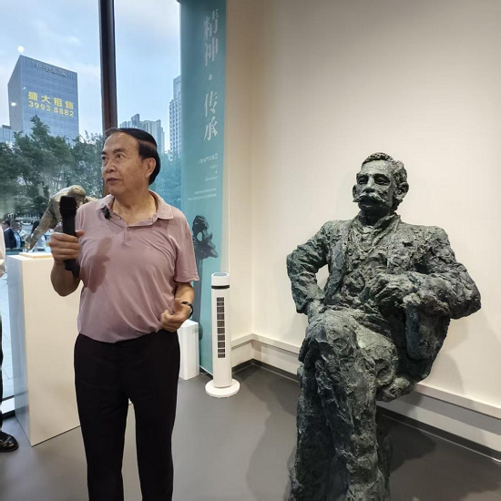 著名雕塑家、画家、联合国首任“环保艺术大师”袁熙坤在现场讲解作品的创作理念