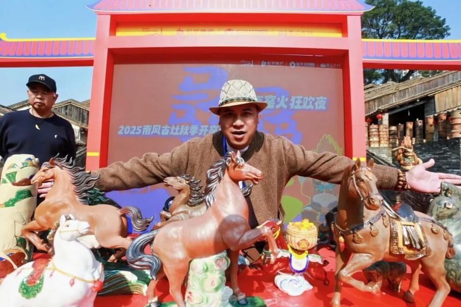 IP跨界成为本届创意周彰显“潮流感”的亮眼特色。开幕式前,南风古灶举办“骉骉鎏光——千年窑火狂欢夜暨2025南风古灶秋季开窑盛会”,集中展示马年生肖主题等柴烧陶艺作品,让市民沉浸式感受千年柴烧文化。
