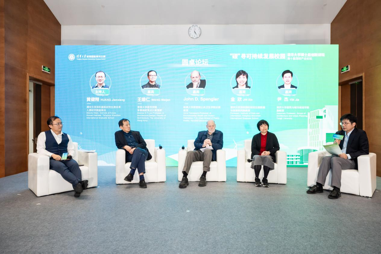在圆桌论坛环节,深圳国际研究生院未来人居研究院副院长黄健翔、王维仁、约翰·D·斯宾格勒、深圳国际研究生院数据与信息研究院教授金欣、同济大学建筑与城市规划学院副教授尹杰等学界专家代表围绕“低碳校园的技术创新与实践路径”展开深入探讨。