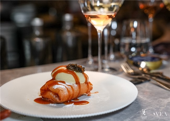 Kaluga Queen的方法论里有一条,美食的意义不在于重复,而是不断开创新的风格。VEA餐厅的鱼子酱菜单中有一道鱼子酱配冰淇淋,不同于将鱼子酱放置在冰淇淋上的普通做法,Vicky将鱼子酱打碎和意式冰淇淋混合在一起,最后浇上焦糖酱汁。“看山不见山”的创意让整个餐品焕然一新。