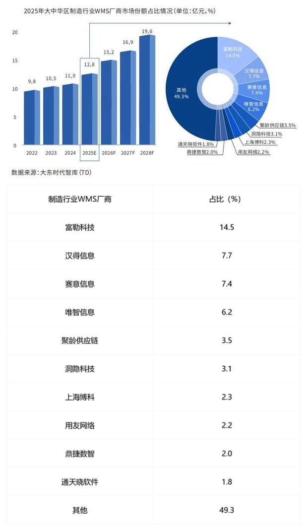 根据大东时代智库(TD)调研数据,2025年大中华区制造行业WMS市场规模预计达12.8亿元,同比增长16.9%,2022-2025年复合增长率为9.3%。整体来看,市场在智能化转型的持续驱动下保持增长韧性,受两方面影响,一是制造企业内生性降本增效与流程优化需求;二是国家在智能仓储与数字化供应链领域的持续政策引导。