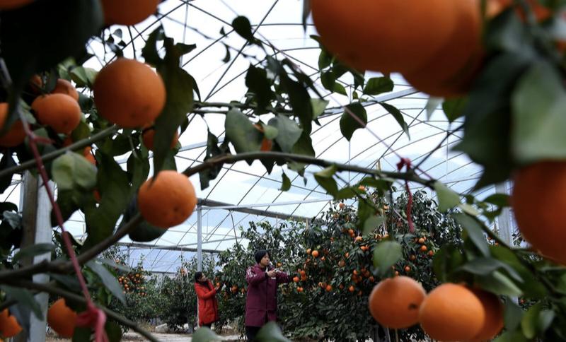 初冬时节,土桥农场管理区的钢架大棚内,橙黄饱满的“红美人”柑橘挂满枝头。果农们穿梭其间,熟练地进行采摘、分拣、包装,一派繁忙景象。