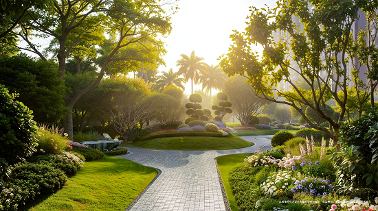 社区环境生态资产系统方面,进行了25年植物群落规划与设计,打造千亩自然生态系统,精心配植本土植物群落,构建具有高碳汇能力和生物多样性的立体绿化。以法国莫奈花园为蓝本,搭配约250种珍稀花草,打造约2万方莫奈花园,以芬芳香草疗愈与雾森系统,实现微环境 调节与超五感自然疗愈。通过遍布社区的传感器网络与智能喷淋、导风系统,自动调节社区温湿度,有效缓解城市热岛效应。利用特定植物与生态水景的组合,结合“森环系统”,显着提升园区负氧离子浓度,营造天然氧吧环境。