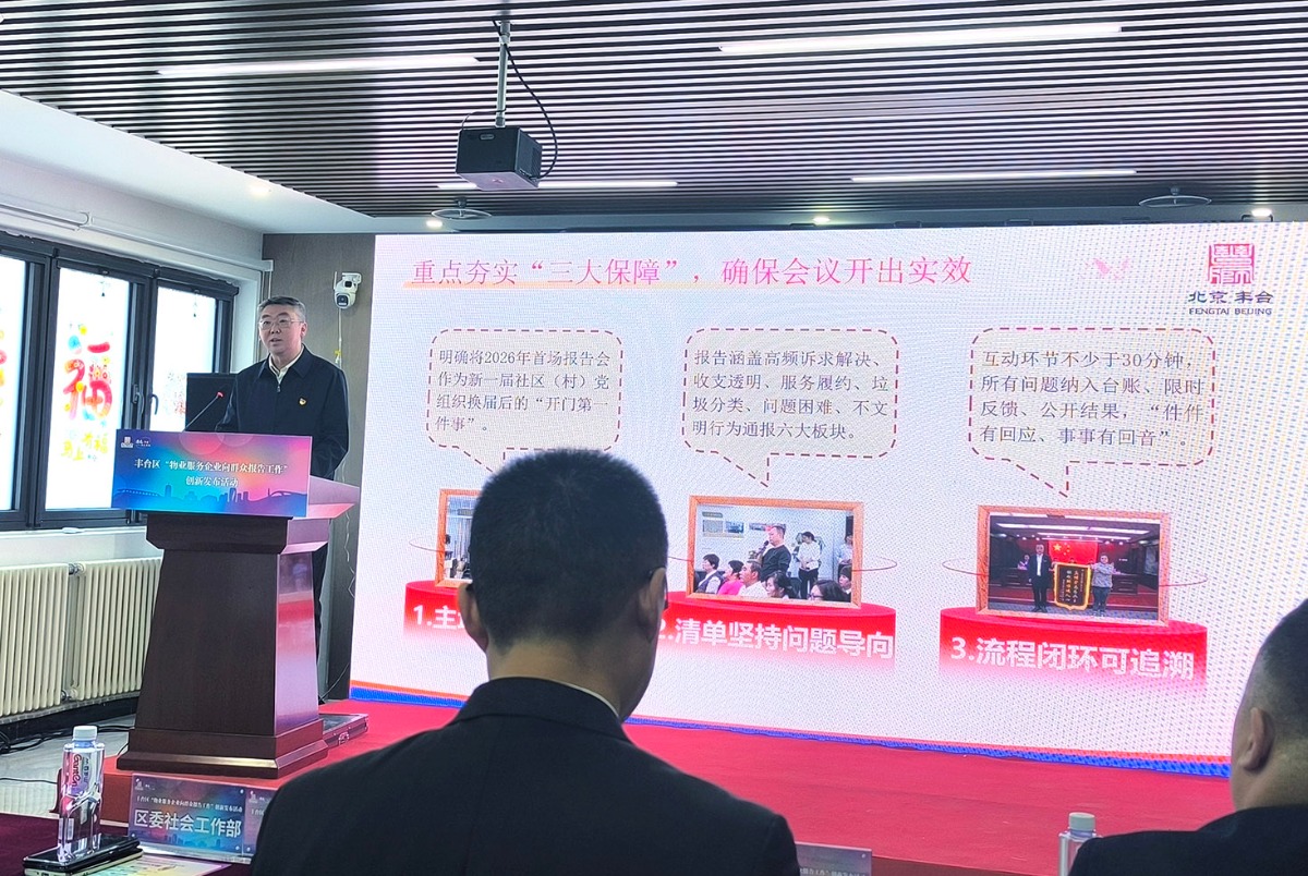 从全区“接诉即办”数据来看,物业服务类诉求占比持续突出,这背后所折射的是社区(村)、物业、居民“三方困境”,为此,今年丰台区锚定“先锋引领 全面跃升”目标,将报告工作打造为制度化、阳光化的沟通平台,致力于实现三个目标:推动沟通“无障碍”,让物业“账本”与居民“心事”公开对话;推动监督“实打实”,变被动接诉为主动报告履职,服务质量由群众评判;推动合力“聚起来”,让物业成为党联系服务群众的坚实力量。杨勇部长强调,报告会不是企业的“独角戏”,也不是走过场,而是坚持 “党建引领、依法督导、平等会商、报告履职”原则,在街镇党委领导下,由社区(村)党组织具体牵头的“共建共治”民主协商会,力求开出实效。
