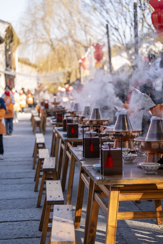 除了新年仪式感和音乐体验,盐官的新春美食真的让人眼花缭乱。首推城隍庙前的“宴球街宴”,长桌铜锅涮肉配暖炉和寓意圆满的宴球,冬天吃着人暖心也暖。惊喜的是,宴球街宴席间还有音乐主题表演,吃着美食听着歌,还能听音乐人分享创作故事、一起大合唱,这聚餐新体验感仪式感拉满。