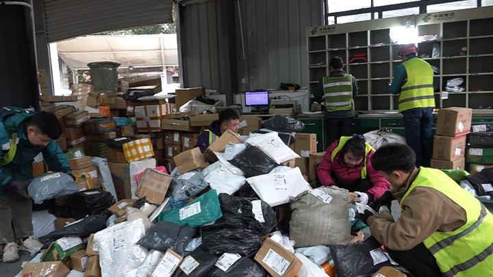 “我现在正在做的是快递分拣,年关将至,我们货比较多,以前我们都是用自动分拣机分货,现在年货比较多,大家买的比较多,我们所以现在加班加点在分拣货物。”快递员刘贵成说。