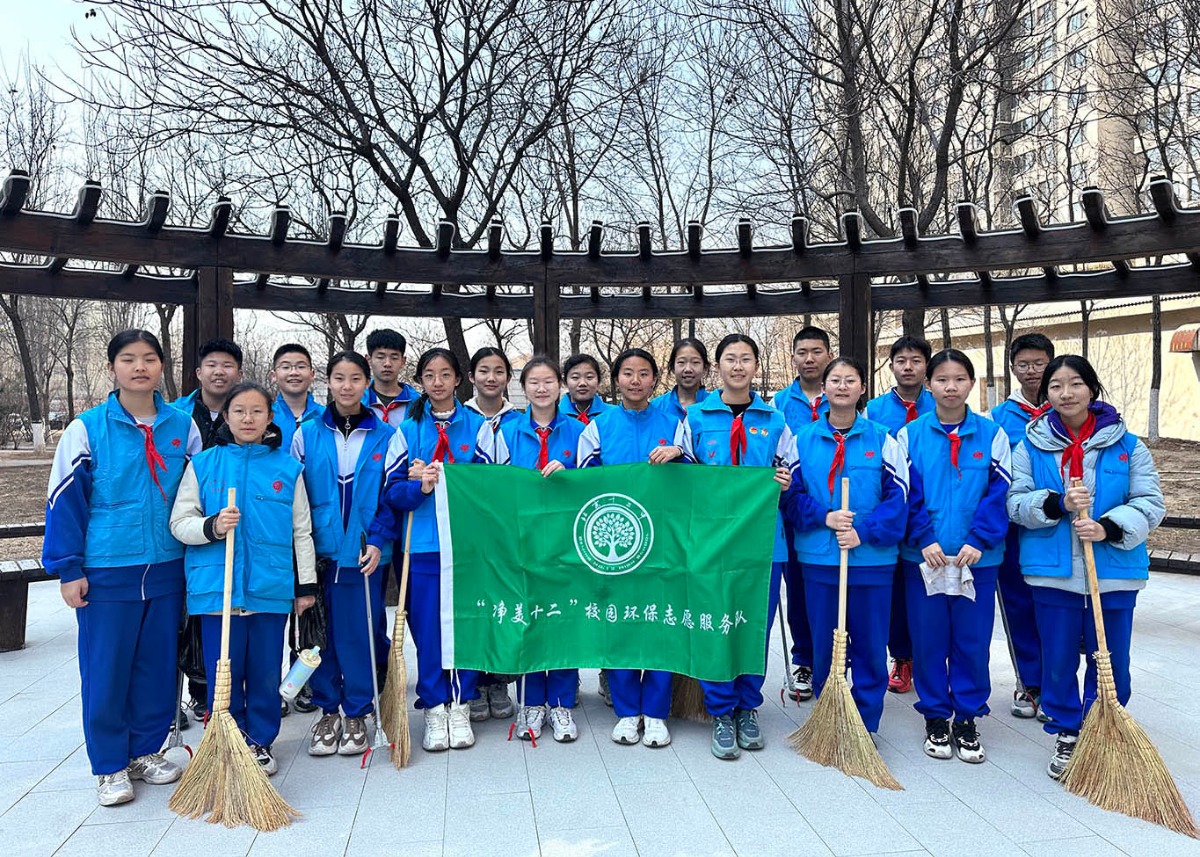 以志愿服务为载体,作为全国首个“中学生学雷锋慈善公益联盟发起校”,北京十二中打造了覆盖全校各年级的1400余人校级志愿服务队,累计服务时长超1.7万小时,形成“校队统筹、分队联动、全员参与”的志愿服务模式。服务队下设校园环保、志愿讲解、图书馆服务、赛会服务等特色分队,精准开展校内志愿服务;同时坚持“走出校园、服务社会”,组织学生深入社区、养老院、公共场所开展义务支教、敬老爱老、文明引导等活动,2025年暑假开展的“青春学堂”公益活动,为社区居民带来多领域特色课程,彰显新时代青年担当。潘嘉硕、刘婉怡、谭一祎等同学获评“丰台好人”季榜人物,成为师生践行雷锋精神的鲜活范例。其中,谭一祎同学长期坚守中国人民抗日战争纪念馆志愿讲解岗位,累计服务400余场次。