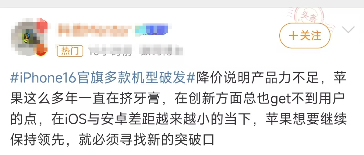 值得一提的是,这是苹果新机发布以来官方渠道首次降价。就在10月21日,“iPONE16官旗多款机型破发”、“iPone16官方罕见降价1600元”等词条冲上热搜,其中上述两词条阅读量均超过5000万。