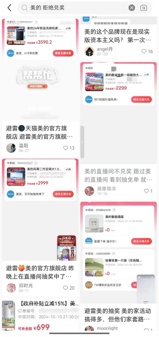 比如在小红书平台,通过搜索“拒绝兑奖”可以看到,不少中奖的消费者表示自己参加了美的直播间的抽奖活动,中奖后却因没有备注等原因,没能成功兑奖。有的消费者甚至因为与主播理论而被禁言。