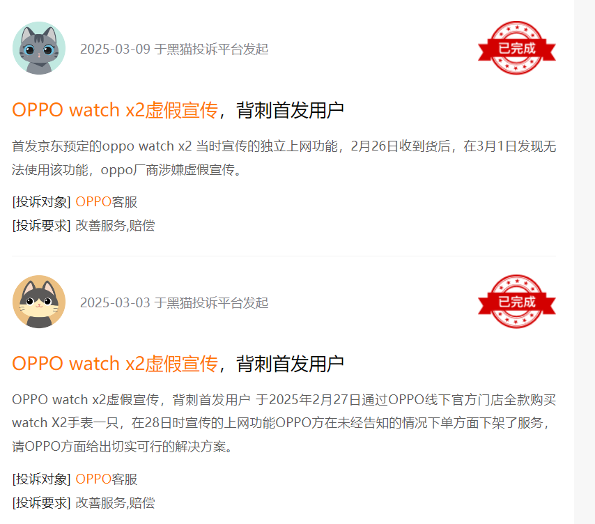 然而,在新品发布初期,黑猫投诉、小红书等平台上出现了不少以“OPPO Watch X2虚假宣传”为主题的内容。据悉,2月28日,OPPO官方突然单方面暂停了上网服务,并通知用户该功能将于3月31日终止,而这意味着,大量新购用户将无法体验到被宣传为核心卖点的独立上网功能。