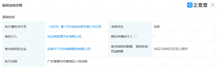 大公科技讯 企查查APP显示,近日,哪吒汽车关联公司合众新能源汽车股份有限公司(以下简称“合众新能源汽车”)新增一则股权冻结信息,股权被执行的企业为众联天下汽车销售服务有限公司,冻结股权数额1822万余元人民币,冻结期限自2024年11月13日至2027年11月12日,执行法院为广东省惠州市惠城区人民法院。