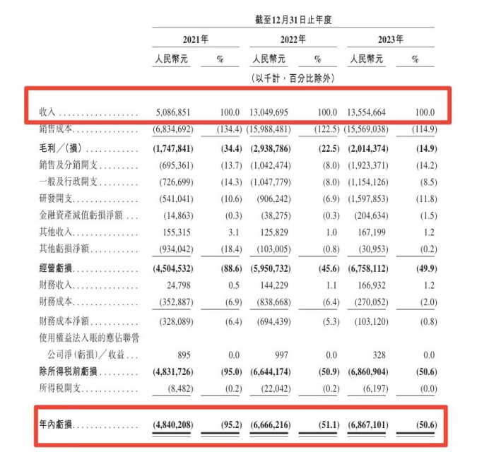 6月26日,合众新能源汽车向港交所递交上市申请。招股书显示,2021年至2023年,公司实现营业收入分别约为50.87亿元、130.50亿元、135.55亿元,净亏损约为48.4亿元、66.66亿元、68.67亿元,三年累计亏损超183亿元。