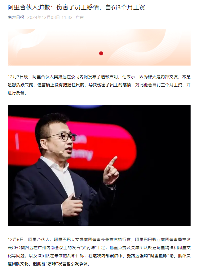 据南方日报等媒体报道,12月6日,阿里合伙人,阿里巴巴大文娱集团董事长兼首席执行官、阿里巴巴影业集团董事局主席兼CEO樊路远在广州内部会议上的发言“火药味”十足,他重点提及灵犀团队缺乏阿里精神和阿里文化等问题,以及该团队在未来的战略目标,在这次内部演讲中,樊路远强调“阿里血脉”论,批评灵犀团队文化。但此番“爹味”发言也引发争议。