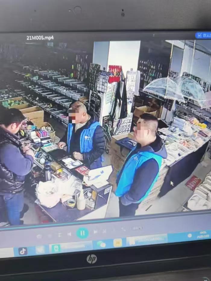 据店内监控视频截图显示,3名男子都穿着前胸、后背带有支付宝字样的马甲,似乎在证明他们“支付宝工作人员”的身份。