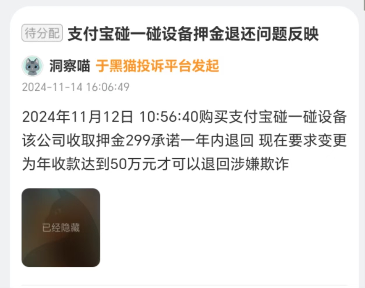 商家表示,2024年11月12日购买了支付宝碰一下设备,该公司收取押金299元,并承诺一年内退回,但现在却变更为年收款达到50万元才可以退回(押金),涉嫌欺诈。