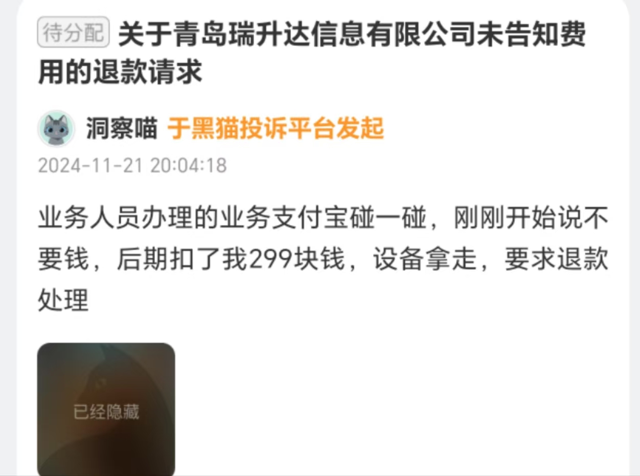 另外一位商家也遭遇了同样的情况。他表示:“业务人员办理支付宝碰一下时,刚开始说不要钱,后期扣了299元,设备拿走,要求退款处理。”