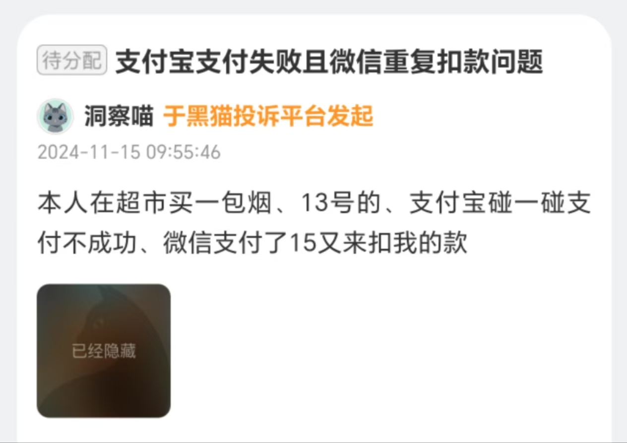 消费者表示:“本人在超市买一包烟、13号的、支付宝碰一下支付不成功、微信支付了15元后,又来扣我的款。”