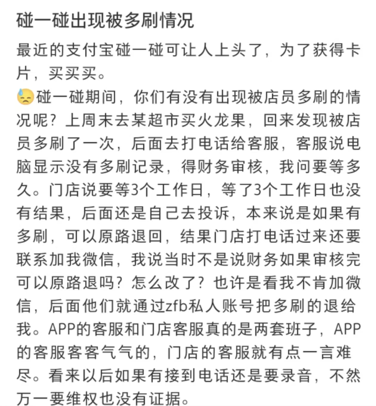 另有消费者在小红书发笔记称:“去某超市买火龙果,(用碰一下支付后)回来发现被店员多刷了一次,后面去打电话给客服,客服说电脑显示没有多刷记录,得财务审核,需要等3个工作日,然而等了3个工作日也没有结果,后面还是自己去投诉。”