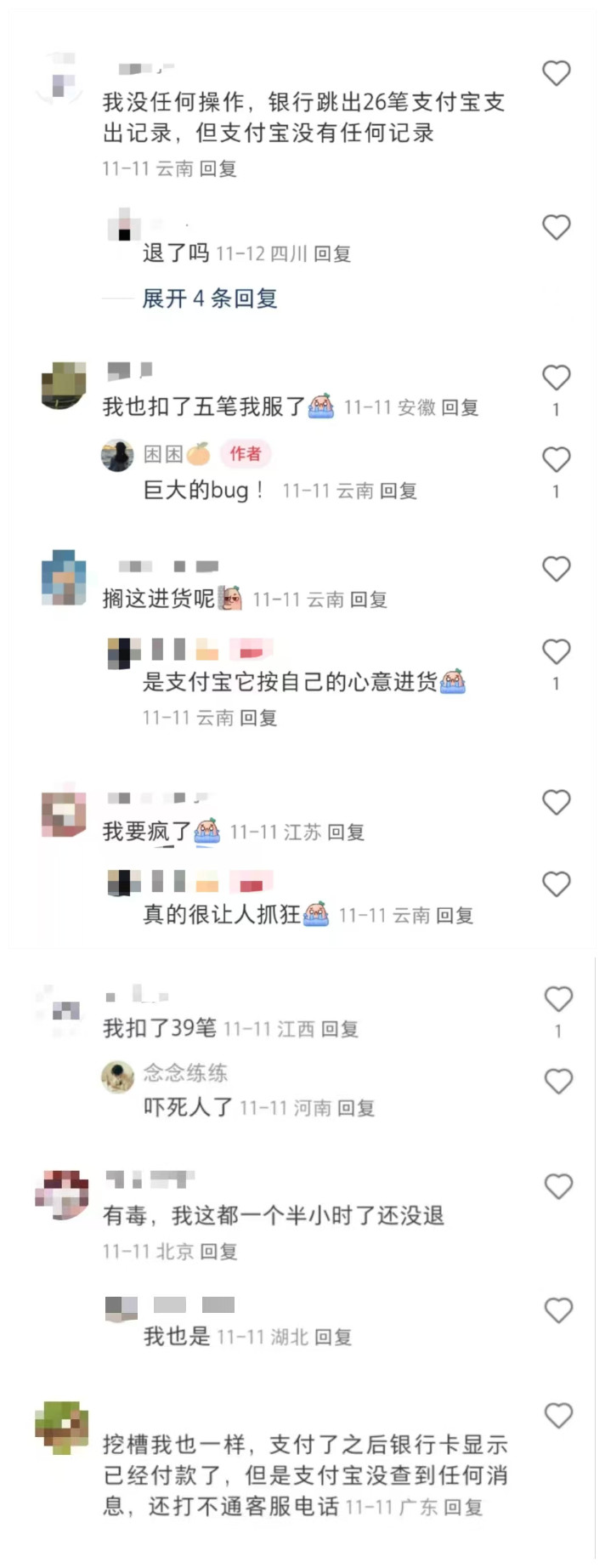 另有消费者表示,我没有任何操作,银行跳出26笔支付宝支出记录,但支付宝没有任何记录。