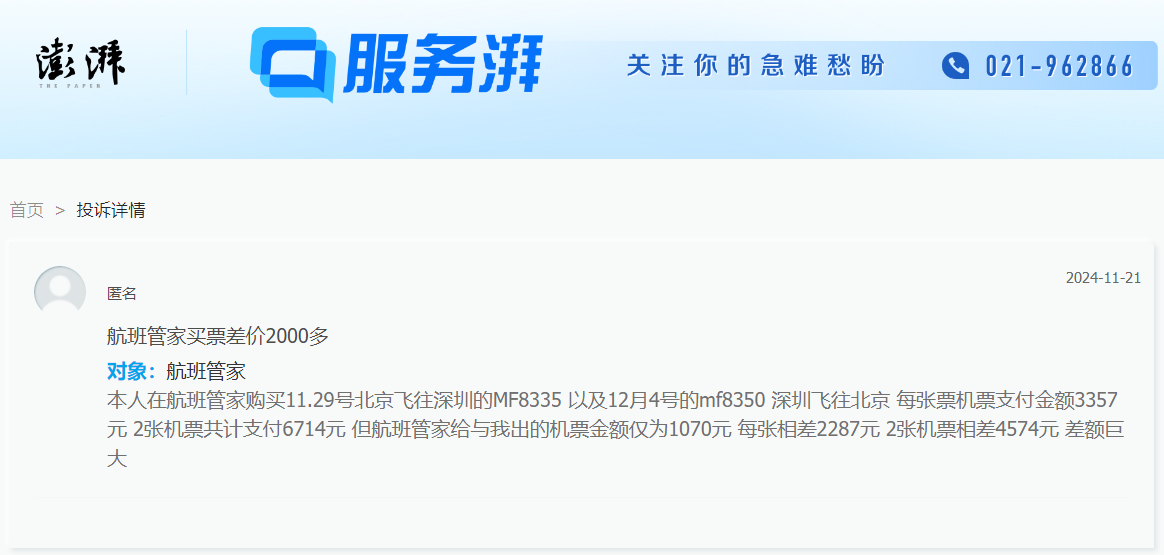根据湖南日报等媒体报道,日前,一消费者通过澎湃公众互动平台“服务湃”反映,11月17日他通过航班管家App购买北京至深圳的往返机票,然后登录航旅纵横App后发现,花费3357元购买的11月29日北京至深圳的经济舱,航旅纵横App显示“含税票价”仅为1070元。