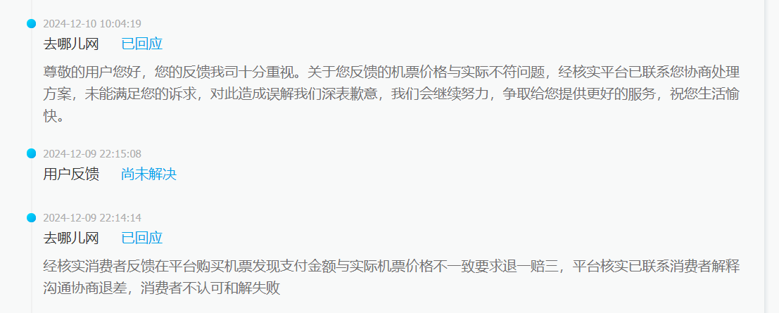 对于上述情况,小孙在12月5日至11日多次在“服务湃”平台进行反馈,但去哪儿网方面至今仍未解决,其中最新一则回应是“尊敬的用户您好,您的反馈我司十分重视。关于您反馈的机票价格与实际不符问题,经核实平台已联系您协商处理方案,未能满足您的诉求,对此造成误解我们深表歉意,我们会继续努力,争取给您提供更好的服务,祝您生活愉快。”在此之前,去哪儿网方面曾回应,“经核实消费者反馈在平台购买机票发现支付金额与实际机票价格不一致要求退一赔三,平台核实已联系消费者解释沟通协商退差,消费者不认可和解失败。”