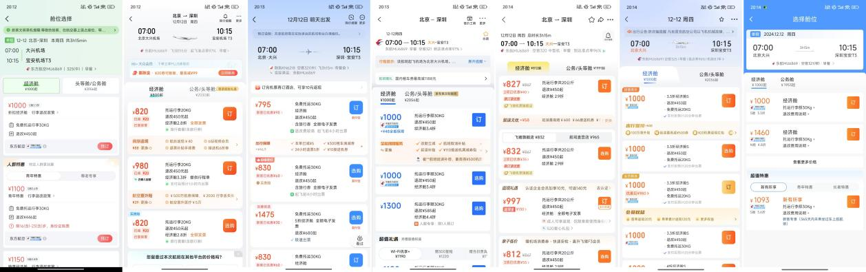 为了验证这一情况,大公科技在航旅纵横、去哪儿旅行、智行火车票、携程旅行、飞猪旅行、航班管家、铁路12306七个app中,搜索了12月12日从北京(大兴)飞往深圳(宝安T3)的机票,时间均为7:00-10:15,航班号均为MU6869,但上述平台的机票价格都不相同。