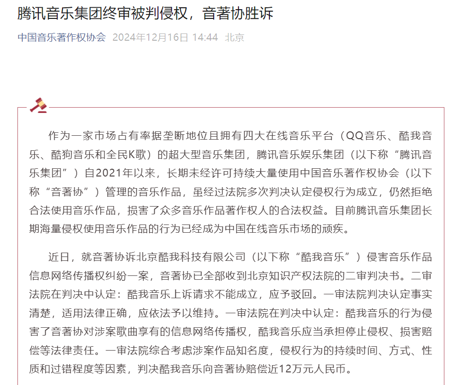 据了解,音著协已经对腾讯音乐集团多次提起侵权之诉,已经生效的判决中,法院全部判决腾讯音乐集团旗下平台构成侵权,其他亦有多起对QQ音乐、酷我音乐、酷狗音乐、全民K歌平台的维权诉讼案件正在法院审理过程中。