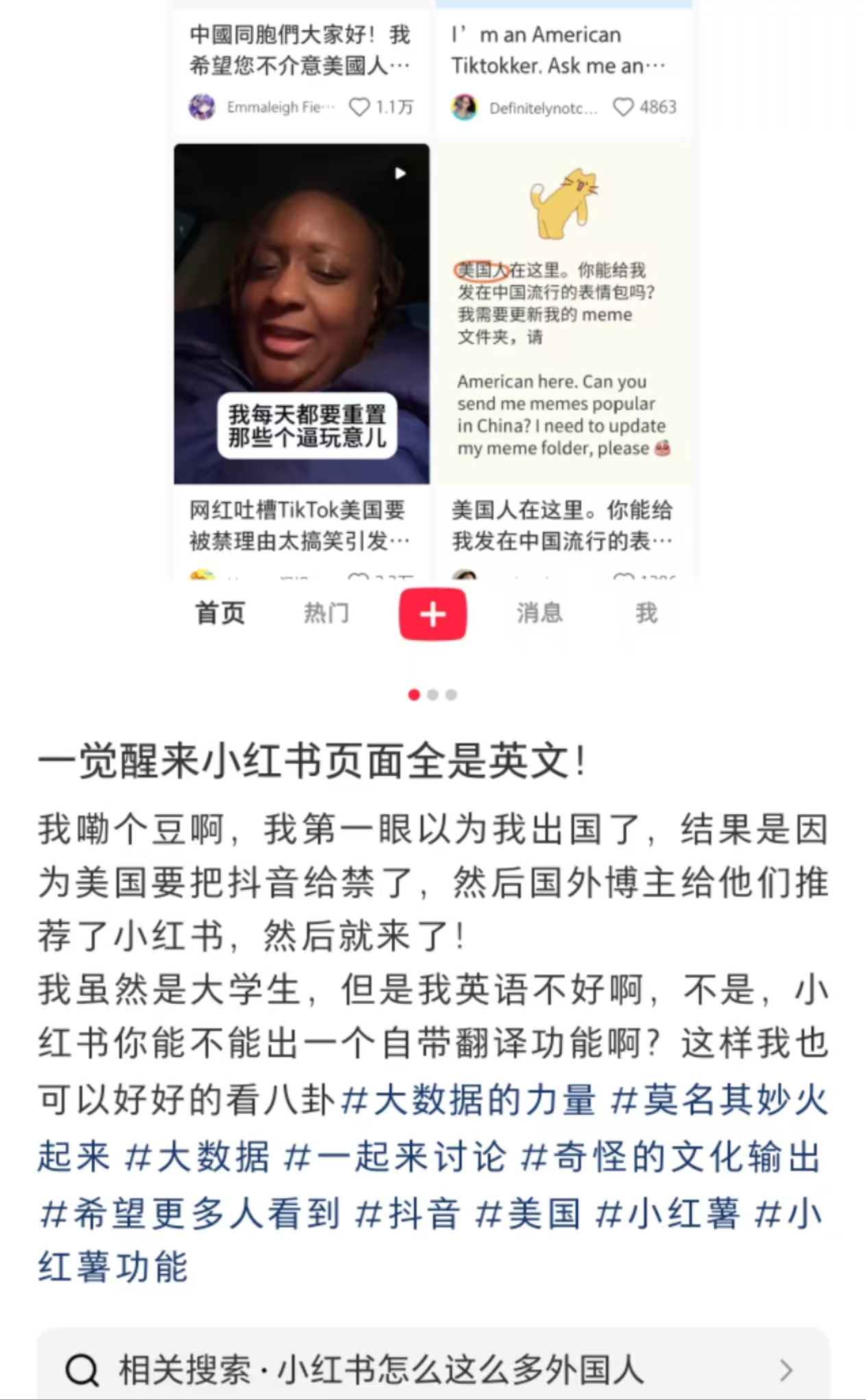 另有网友表示:“第一眼我以为出国了,结果是因为美国要把抖音给禁了,国外博主给他们推荐了小红书。我虽然是大学生,但是英语不好,小红书你能不能出一个自带翻译功能。”