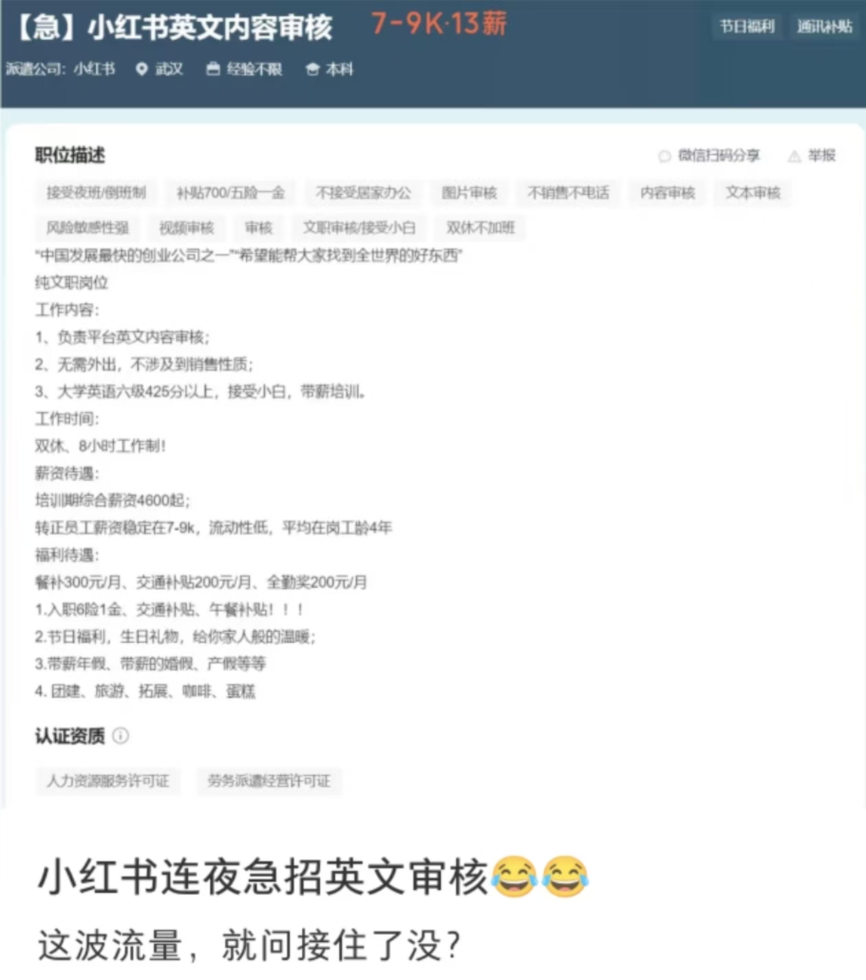 据凤凰网财经消息,小红书正在急聘英文内容审核员。工作内容为负责平台英文内容审核,要求大学英语六级425分以上,接受小白,带薪培训。转正后薪资在7000-9000。