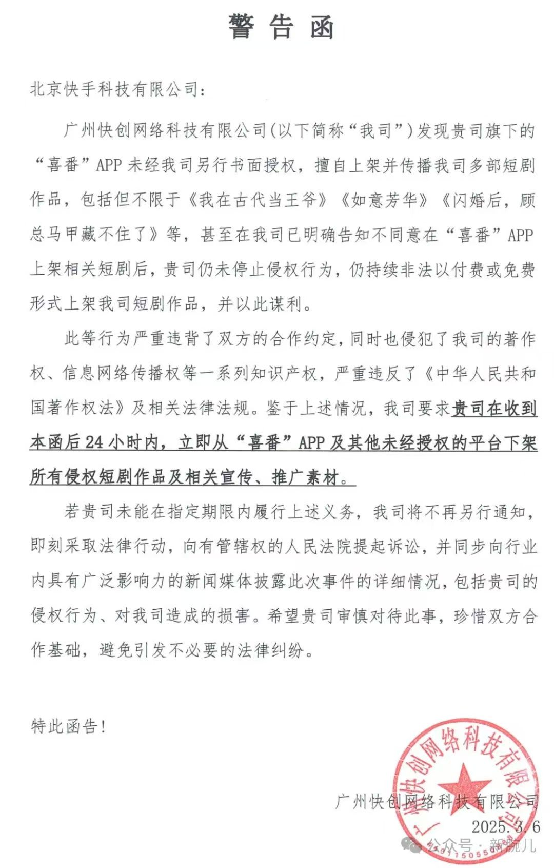快创认为,此等行为严重违背了双方的合作约定,同时也侵犯了公司的著作权、信息网络传播权等一系列知识产权,严重违反了《中华人民共和国著作权法》及相关法律法规。鉴于上述情况,快创要求快手在收到警告函后24小时内,立即从喜番APP及其他未经授权的平台下架所有侵权短剧作品及相关宣传、推广素材。