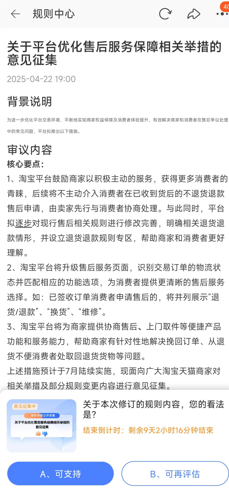 据悉,4月22日晚间,淘宝方面公布《关于平台优化售后服务保障相关举措的意见征求》,其中“审议内容核心要点”显示,淘宝平台鼓励商家以积极主动的服务,获得更多消费者的青睐,后续将不主动介入消费者在已收到货后的不退货退款售后申请,由卖家先行与消费者协商处理。与此同时,平台拟逐步对现行售后相关规则进行修改完善,明确相关退货退款情形,并设立退货退款规则专区,帮助商家和消费者更好理解。此外,淘宝平台将升级售后服务页面,识别交易订单的物流状态并匹配相应的功能选项,为消费者提供更清晰的售后服务选择。如:已签收订单消费者申请售后的,将并列展示“退货/退款”、“换货”、“维修”。同时,淘宝平台将为商家提供协商售后、上门取件等便捷产品功能和服务能力,帮助商家有针对性地解决挽回订单、从退货不便消费者处取回退货货物等问题。