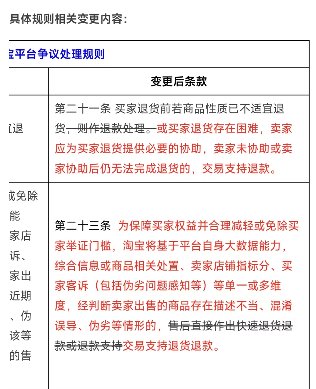 此次政策调整,涉及《淘宝平台争议处理规则》,其中第二十一条删除“则做退款处理”部分,第二十三条删除“售后直接做出快速退货退款货退款支持”部分。