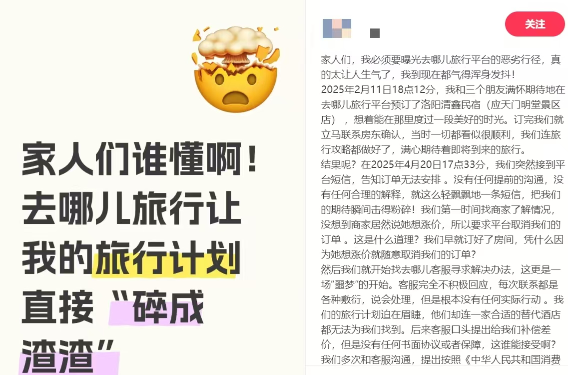 “去哪儿网让我的旅行计划直接‘碎成渣渣’。”有消费者在社交平台发布笔记控诉去哪儿网。