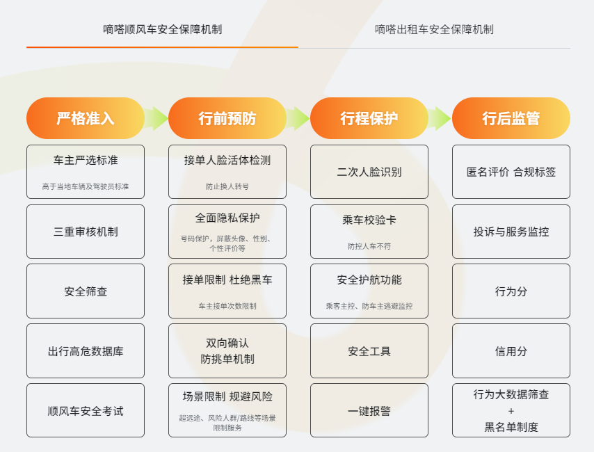 事实上,在嘀嗒出行官网上,可以看到一个关于“嘀嗒安全”的选项,其中“嘀嗒顺风车安全保障机制”中,明确写明了严格准入、行前预防、行程保护、行后监管机制。