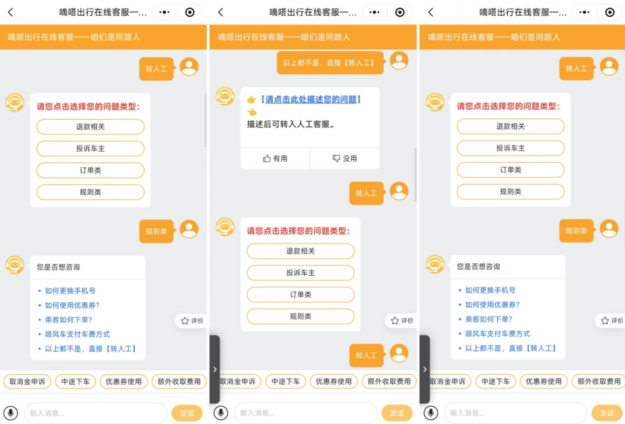 但是,为什么嘀嗒出行会在半年内连续出现两起“司机弃客”事件?乘客的出行安全究竟该如何保障?针对以上问题,大公科技试图联系嘀嗒出行,但无论是拨打客服电话还是联系小程序上的在线客服,均未有人工回复。不仅如此,大公科技注意到,如果没有注册嘀嗒出行账号,该品牌客服电话是无法博通的。而在小程序中,大公科技以乘客身份不断选择“转人工”选项,但其智能客服一直要求选择问题类型、描述问题等。