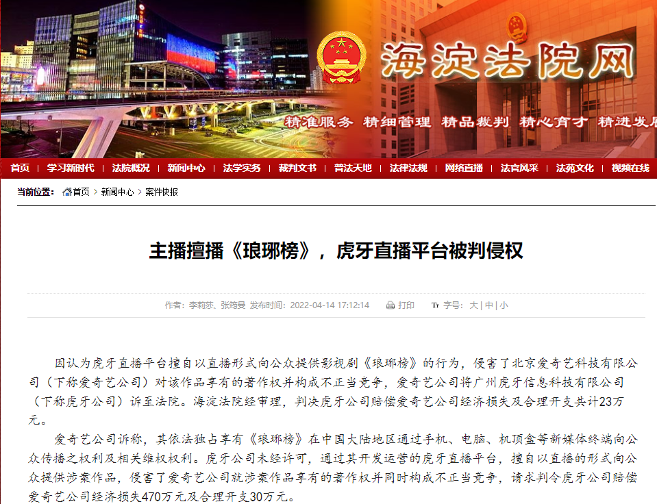 事实上,这也并非虎牙公司首次陷入侵权纠纷。比如在2022年,北京市海淀区人民法院公布案件,因认为虎牙直播平台擅自以直播形式向公众提供影视剧《琅琊榜》的行为,侵害了北京爱奇艺科技有限公司(下称爱奇艺公司)对该作品享有的著作权并构成不正当竞争,爱奇艺公司将广州虎牙信息科技有限公司(下称虎牙公司)诉至法院。海淀法院经审理,判决虎牙公司赔偿爱奇艺公司经济损失及合理开支共计23万元。