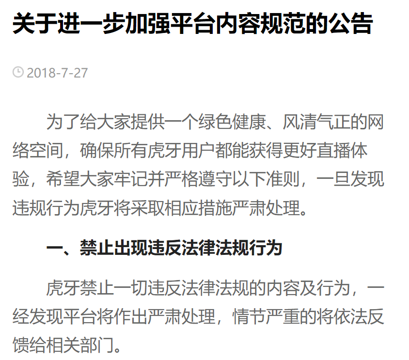 但是,大公科技注意到,早在2018年7月27日,虎牙直播曾发布一篇名为《关于进一步加强平台内容规范的公告》,其中第一条“禁止出现违反法律法规行为”中明确提到,“虎牙禁止一切违反法律法规的内容及行为,已经发现平台将做出严肃处理”等。