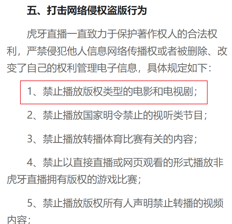 此外,在上述公告中,第五条“打击网络侵权盗版行为”中也提到“严禁侵犯他人信息网络传播权或者被删除、改变了自己的权利管理电子信息”。但在该项规范具体规定下,第一条就注明“禁止播放版权类型的电影和电视剧”。