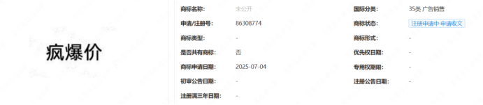 企查查信息显示,近日,饿了么关联公司拉扎斯网络科技(上海)有限公司(以下简称“拉扎斯公司”)申请注册“疯爆价”商标,国际分类为广告销售,当前商标状态为等待实质审查。