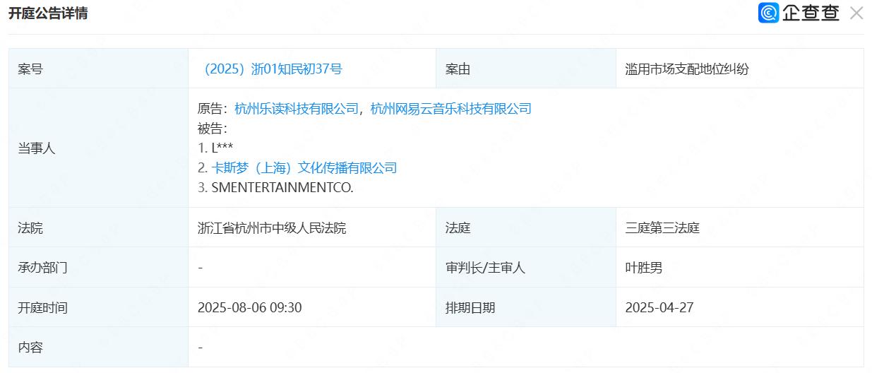 企查查APP显示,近日,法院公开杭州乐读科技有限公司、杭州网易云音乐科技有限公司起诉SM ENTERTAINMENT CO. 、卡斯梦(上海)文化传播有限公司等开庭信息,案由涉及滥用市场支配地位纠纷。