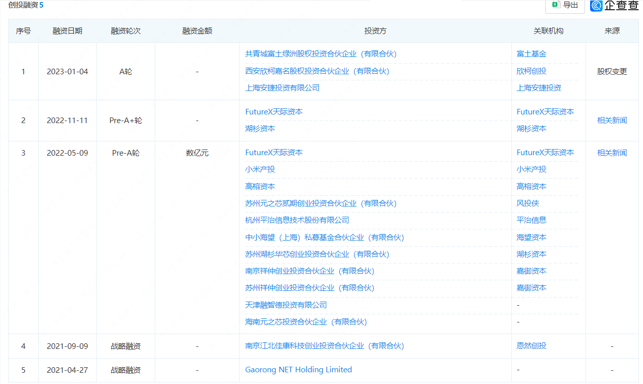 值得一提的是,虽然尊湃通讯成立时间仅有四年多,但其投融资记录共有5轮。据企查查信息,在尊湃通讯成立后不久的4月27日,该公司完成战略融资,投资方为Gaorong NET Holding Limited;同年9月9日,又拿到了恩然创投(南京江北佳康科技创业投资合伙企业(有限合伙))的战略融资。