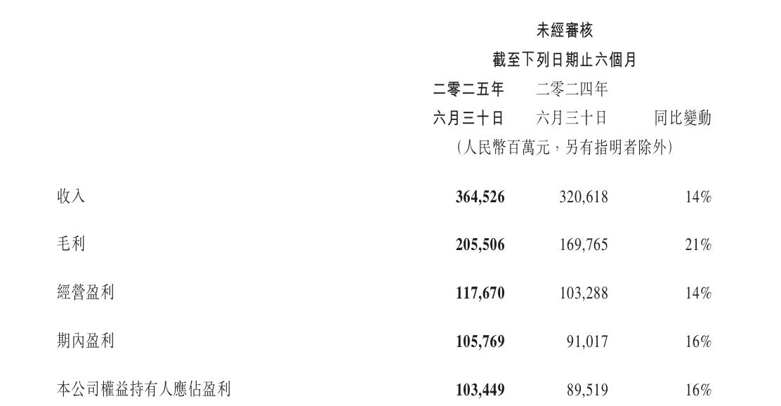 财报显示,2025年上半年,公司实现收入3645.26亿元人民币,同比增长14%;经营盈利为1176.7亿元,同比增长14%;期内盈利录得1057.69亿元,同比增长16%;公司权益持有人应占盈利1034.49亿元,同比增16%。