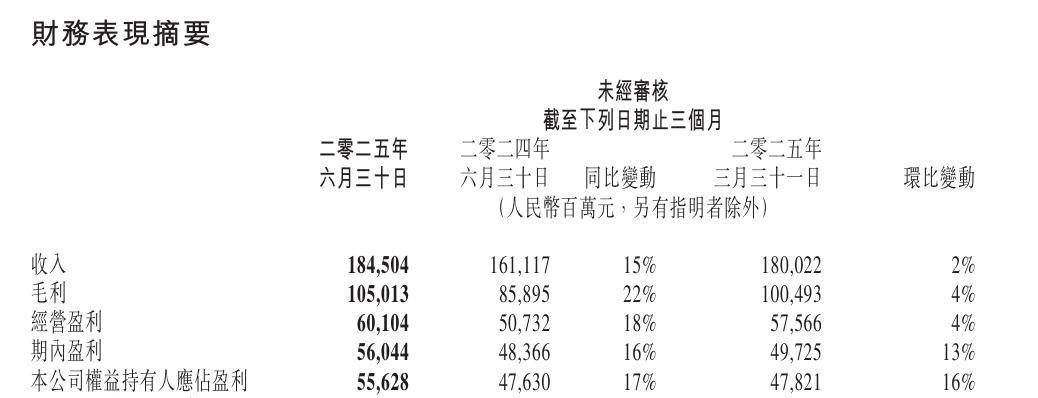 2025年第二季度,公司实现收入1845.04亿元,同比增15%;公司权益持有人应占盈利556.28亿元,同比增17%。