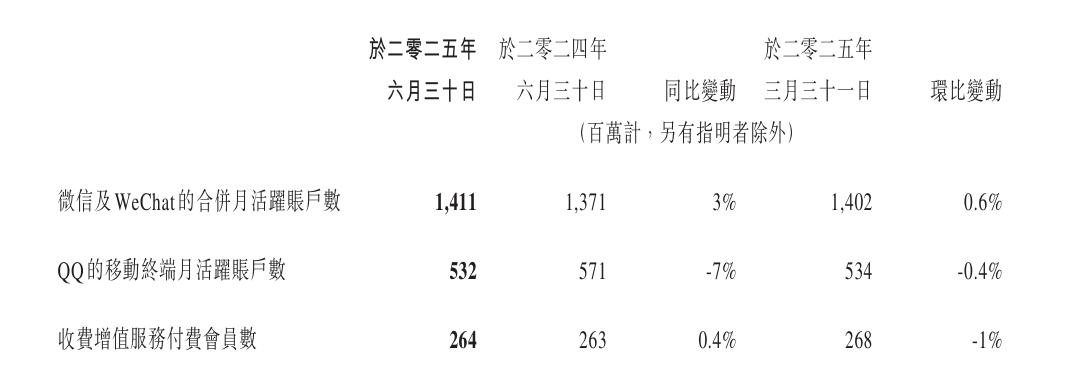 经营资料显示,截至2025年6月30日,微信及WeChat合并月活跃账户数达14.11亿,同比增长3%,环比增长0.6%;QQ的移动终端月活跃账户数为5.32亿,同比下降7%,环比下降0.4%;收费增值服务付费会员数为2.64亿,同比增长0.4%,环比下降1%。
