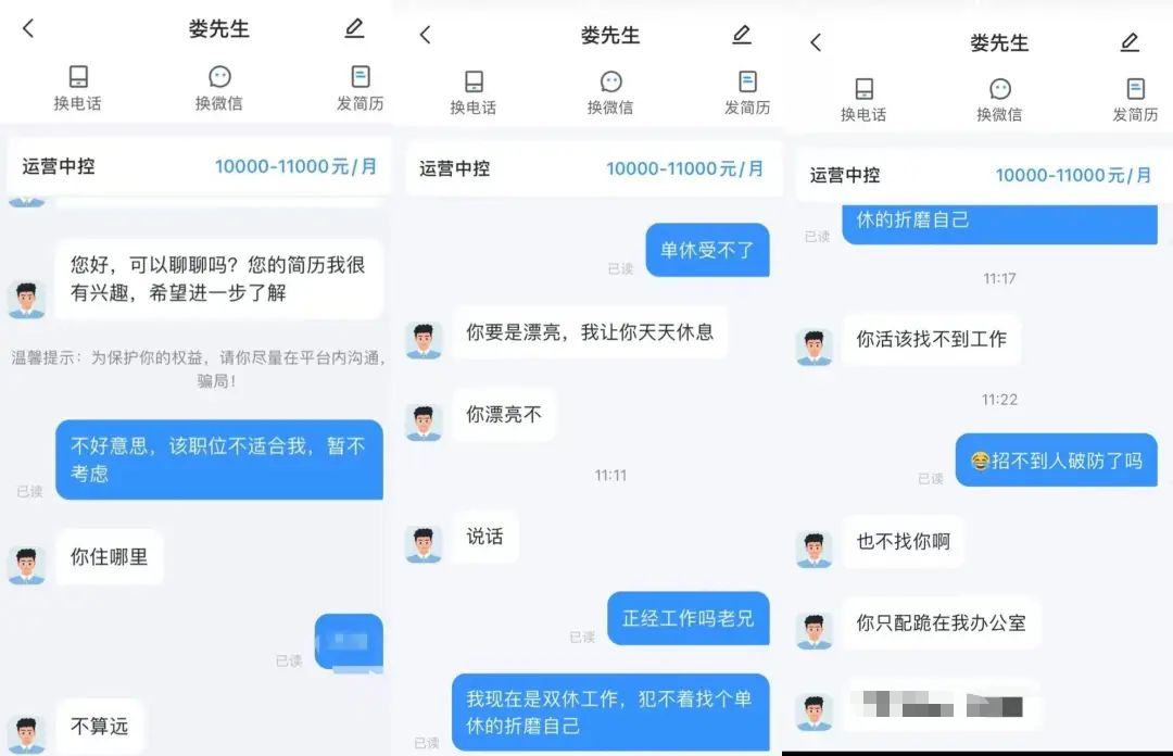 从该网友发布的聊天记录截图可以看到,当求职者提出“受不了单休”“现在是双休工作,犯不着找个单休的折磨自己”后,招聘人员“娄先生”回复“你要是漂亮,我让你天天休息”“你漂亮不”“你活该找不到工作”“你只配跪在我办公室”等不堪言论。